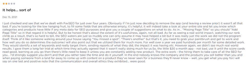 On the positive side, many report noticeable improvements in SEO performance and even sales after using the app consistently. Users also highlight FavSEO’s responsive support and ethical communication as strong points, making it a trustworthy partner for ongoing optimization.