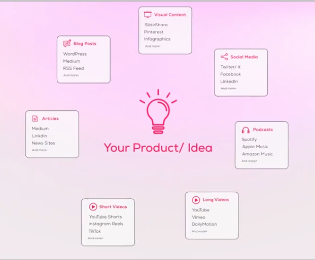 At AmpiFire, our AI-powered AmpCast software transforms your core blog content into 8 different formats: news articles, blog posts, infographics, slideshows, podcasts, long-form videos, short-form videos, and Pinterest-optimized social posts.
