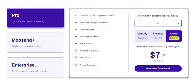 Pro Plan starts at $9/month for 500 contacts (or $7/month with annual billing). This plan includes unlimited email campaigns and sends, email marketing automation, landing pages, subscription forms, and SMTP server access. It does not include transactional emails, SSO & SAML, or a dedicated account manager.
