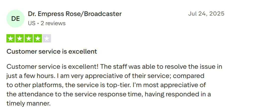 OneStream consistently earns praise for its exceptional customer support. Users highlight the team’s quick response times and effective problem-solving, often resolving issues within hours. Compared to other livestreaming services, creators describe OneStream’s support as faster, more responsive, and genuinely attentive, a major factor in why many continue using the platform.