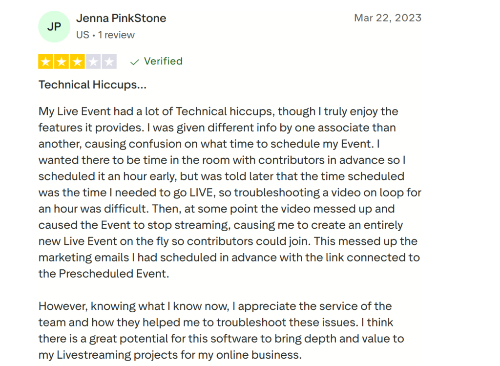 Creators generally describe OneStream Live as a powerful and intuitive tool, though some note occasional technical hiccups during live sessions. One user shared that scheduling confusion caused a delay and required restarting their event midstream, disrupting planned marketing links. Still, they emphasized the helpfulness of the support team, who quickly guided them through troubleshooting. After understanding how scheduling works, the creator expressed greater confidence in using the platform and praised its long-term potential for professional streaming projects.