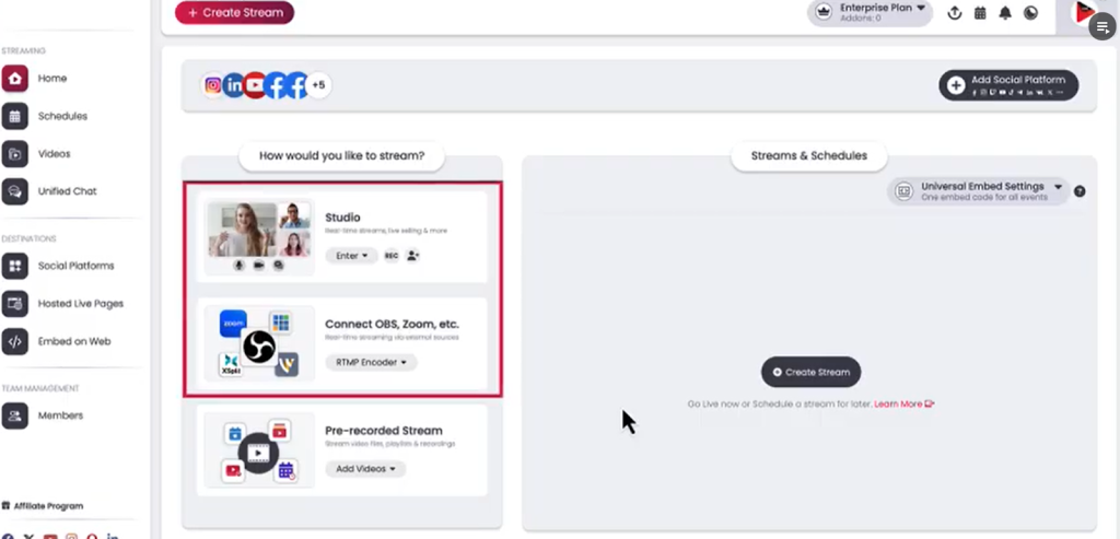 Best for beginners, the Free plan includes 720p streaming to two social platforms, one team seat, and 1 GB of storage. You can schedule up to three events, host one-hour studio sessions with four guests, and pre-record up to fifteen-minute streams. It’s a simple way to learn the basics of multistreaming without commitment.