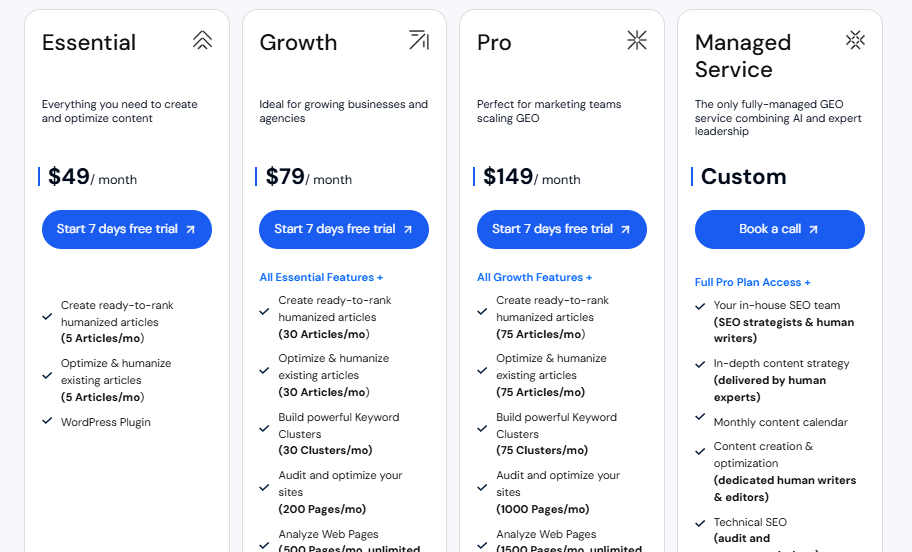 • The Growth Plan at $79 per month provides unlimited AI words, 30 SEO articles monthly, and includes advanced features like SERP analysis tools and team collaboration options. This plan suits growing businesses and small marketing teams.