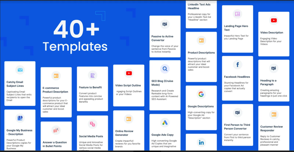 Scalenut includes over 40 AI-powered templates for different types of content, from product descriptions and social media posts to email campaigns and video scripts. Each template is designed for specific use cases, making it easy to generate targeted content quickly.