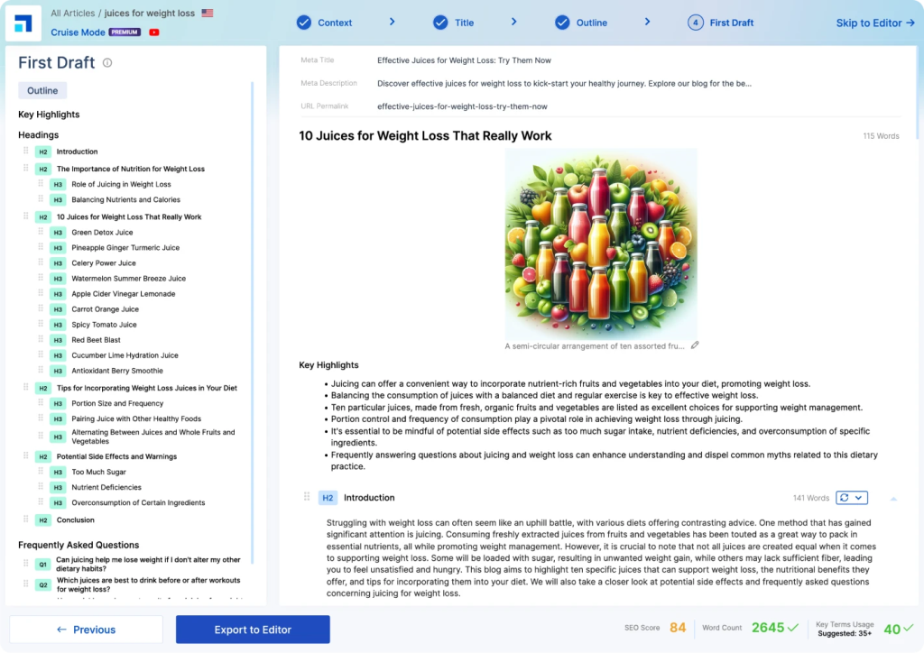 The AI analyzes your target keywords and creates content based on what’s currently ranking well. You provide basic information about what you want to write, and Cruise Mode handles the research, structure, and writing automatically.