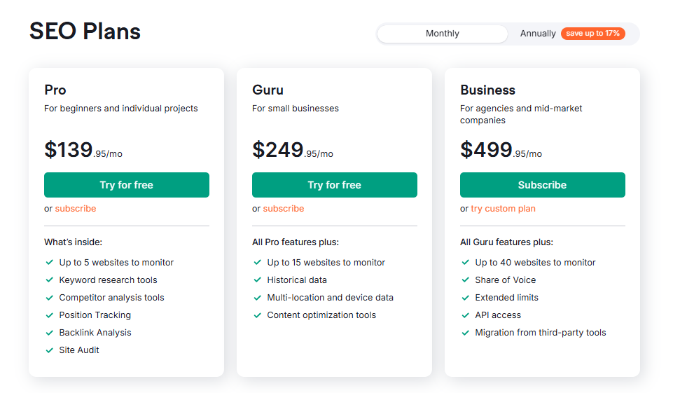 The Pro plan ($139.95/month) covers basic SEO needs for individuals and small businesses with 5 projects and 500 tracked keywords. Guru ($249.95/month) adds historical data, content tools, and supports 15 projects with 1,500 keywords for growing agencies. Business ($499.95/month) includes API access, Share of Voice, and extended limits with 40 projects and 5,000 keywords for large agencies and enterprises.