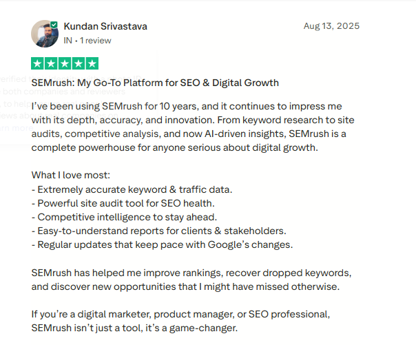 Users praise Semrush for its accurate data, powerful keyword tools, and detailed site audits that catch issues other platforms miss. SEO professionals value its competitor analysis and historical data for tracking progress and proving ROI. Content marketers also highlight the writing assistant and templates for making SEO-optimized content easier to create.