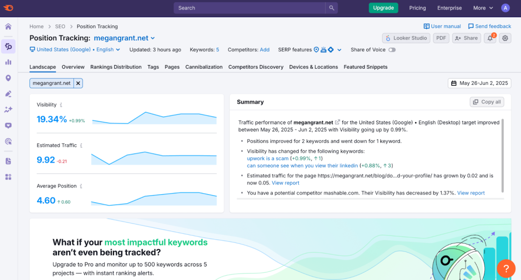Position Tracking shows you exactly where your website ranks in Google for your target keywords. You can track rankings for any location and any device, whether it’s mobile, tablet, or desktop. The tool updates your rankings daily, so you always have fresh data.