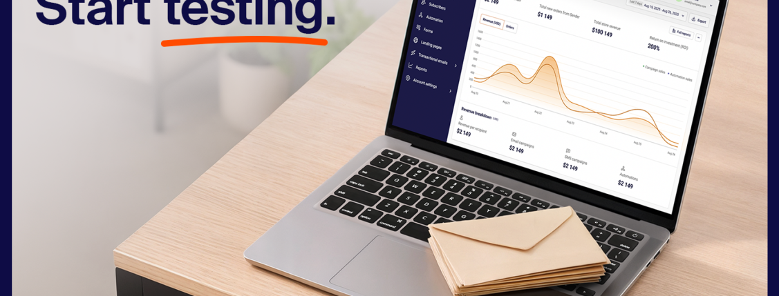 Laptop displaying an email marketing analytics dashboard on a desk with envelopes, alongside the text “Stop guessing. Start testing.” and the Sender logo.