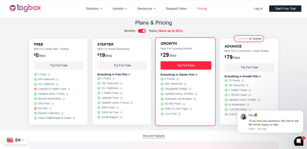 Taggbox keeps pricing straightforward with plans that grow with you. You can pay monthly or save about 20% by going yearly. The pricing plan starts at $19 a month.