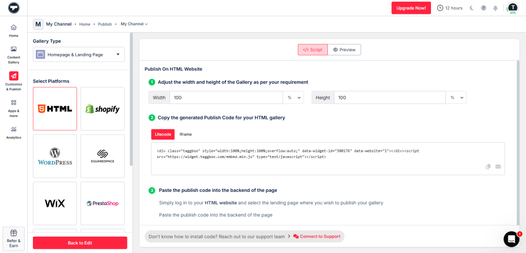 - Generate the embed code and paste it on the backend of your website.